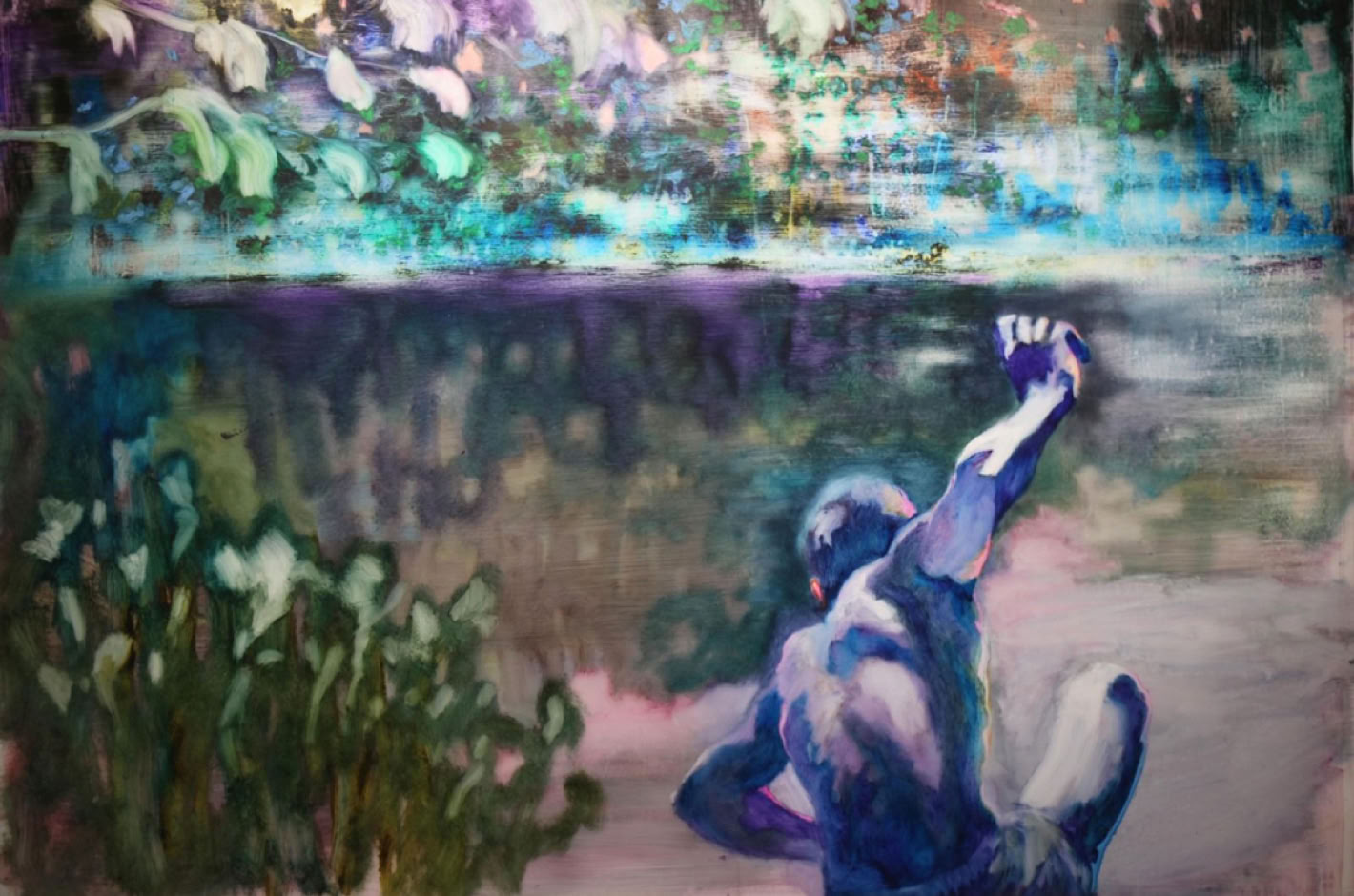 Temps de retrait, moment suspendu dans un lieu chargé d’histoire où les mémoires enfouies semblent sans cesse refaire surface, le séjour en immersion de l’artiste à Fontevraud s’est déroulé dans une forme d’expérience paradoxale, oscillant entre sentiment d’isolement et liberté intérieure retrouvée. Troublantes et énigmatiques, ses toiles sont baignées d’une lumière crue et enveloppante à la fois, comme une matière malléable qui glisse entre les troncs, s’infiltre dans les feuillages et projette sur les corps et les visages des rythmes silencieux. Ombres portées, halos, éclats soudains ou rémanences: les rayons du soleil accompagnent des personnages dans leur cheminement intérieur donnant à chacun de leurs gestes une épaisseur sensible. Chez Sarah Jérôme, la peinture est palpable comme une force en tension : elle se loge dans la chair, imprègne les paysages et confère à chaque détail une densité dramatique.