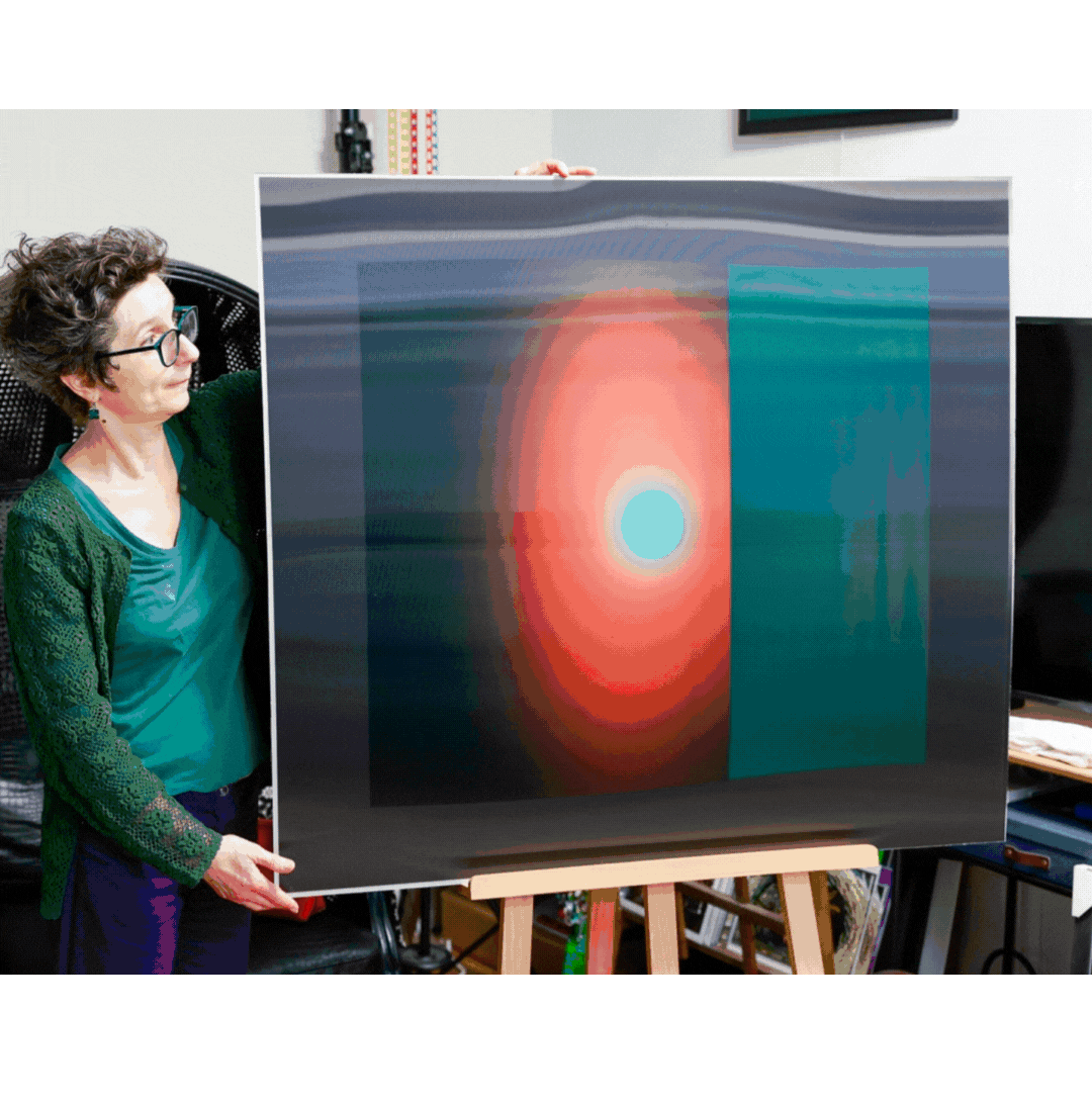 Dans le noir de l’écran, depuis 1990, Anne-Sarah Le Meur, pionnière française en art numérique, code ses images, utilisant l’informatique pour générer formes, couleurs, mouvements. Et ce qu’elle arrive à créer nous laisse stupéfaits et rêveurs. L’abstraction proposée, bien que géométrique, est souple, organique, sensuelle. La ligne droite devient courbe, le contour net jouxte le diffus, l’aplat borde la zone soyeuse ou transparente. Par ailleurs, cette abstraction « moelleuse » s’avère subtile : dans la composition d’apparence simple, voire pauvre, se cachent et émergent, progressivement, de nombreuses relations plastiques opposées : plan ou profondeur ? surface ou substance ? devant ou dedans ?… Enfin, la tache noire, récurrente, qu’elle a trouvée grâce à l’inversion d’un paramètre, est riche d’évocations symboliques, condensant macro et microcosme : astre mort, pupille, cellule ou trou ?! Tous ces ingrédients produisent une excitation visuelle intense, où se mêlent délicatesse, énigme, beauté…
